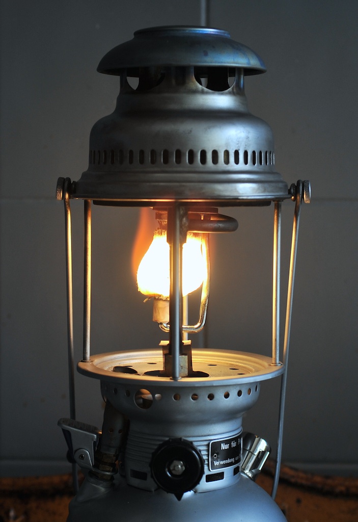 ) Polałem mantla alkiem, napełniłem nerkę i podpaliłem. Skarpeta wypaliła się tak jak na fotkach. Z jednej strony ładnie, z drugiej zaś na czarno (po pierwszym odpaleniu czarne zniknęło i mantla się ładnie ukształtowała). Lampa nieoczekiwanie z wielkim hukiem wystrzeliła daszek, który aż się odbił od sufitu! (Fota bez daszka) Napełniłem nerkę po raz drugi i podgrzałem parownik około minuty bo całość była już dość gorąca. Otworzyłem zawór. Usłyszałem charakterystyczne syczenie i lampa odpaliła. Początkowo paliła z płomieniami w górnej części, potem się uspokoiła ale płomień wychodził poza skarpetę. Wygasiłem diabła i zrobiłem przerwę na papierosa