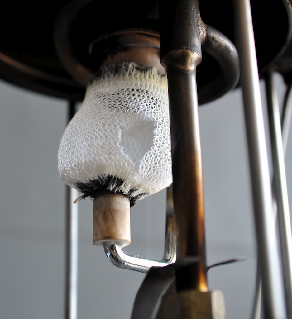 Po tym jak zawór zadziałał pozostało tylko lampę odpalić. Założyłem holder do skarpet z 2 otworami. Nie pasował dobrze i nie chciał wejść na gniazdo brenera. Musiałem znów użyć małego młotka i wbić go na miejsce. Nie wiem, może tak ma być... Trzyma się mocno. Założyłem skarpetę, złożyłem całość do kupy (bez szkła bo stare i szkoda ryzykować