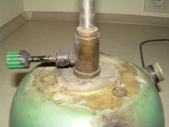 Zamknięcie zbiornika mosiężne noszące ślady potężnego przypalenia, miejscami spalona farba, kompletne, odpowietrznik działa