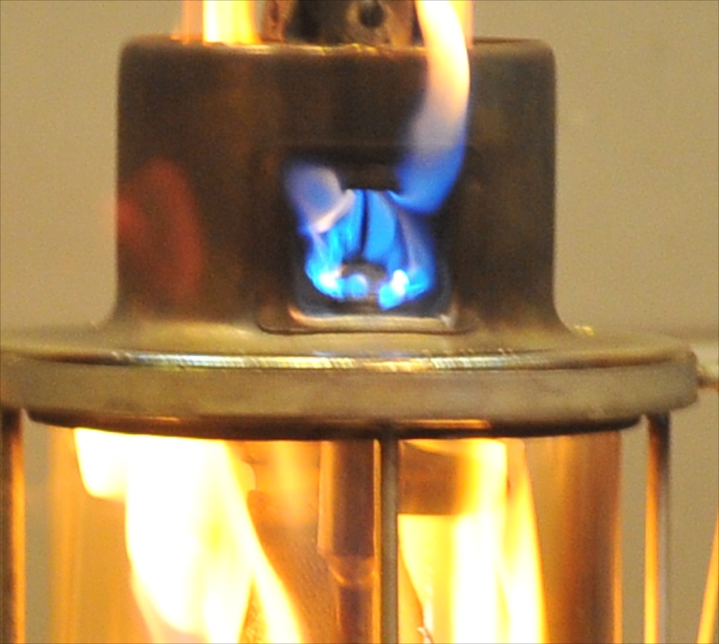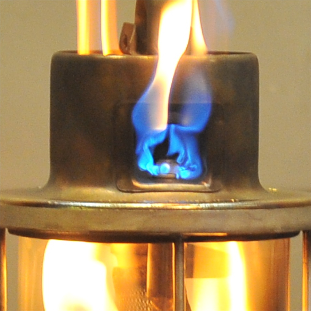 Lampa po złożeniu ponownie odpalona. Tym razem bez wspornika aby wyeliminować jak najwięcej punktów ewentualnej porażki. Paliła się jak poprzednio, czyli płomienie dookoła skarpety ale stabilnie. Wygasiłem, zdjąłem daszek i zapaliłem ponownie. Teraz dostałem niezłe fajerwerki! Dobrze, że nad kuchnią mam przemysłowy okap, który połyka mi ogień z woka jak gotuję na 10k W palniku Big GrinBig GrinBig Grin Ogień poleciał znów na ponad metr w górę. Ale zrobiłem foty dyszy w akcji. Moim zdaniem paliwo leci spod gwinta a nie z samej dyszy. Proszę oceńcie sami. Nie wiem czy dobrze diagnozuję, w końcu robię to pierwszy raz Huh. Teraz zmniejszę skok pręta i bardzo mocno dokręcę dyszę. Jeśli macie inne pomysły to proszę podzielcie się.