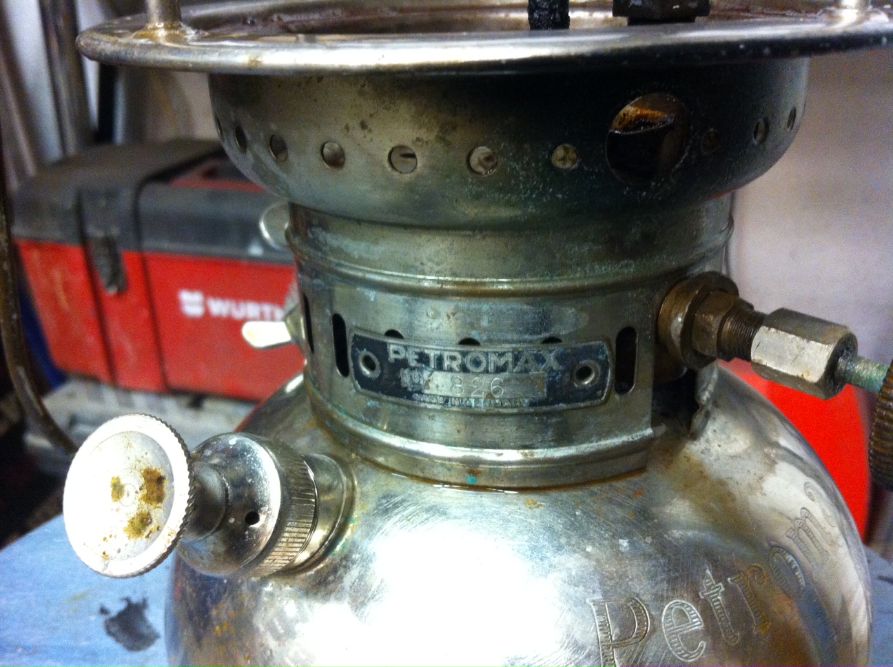 Po nieudanych próbach zakupu Px 828 wpadł mi w oko Px 826 (chć mam już dwa takie) ale to z tytułu że blisko do odbioru (oszczędzam na przesyłce) i w miarę tanio.Pojechałem utargowałem jeszcze parę złotych i przywiozłem do domu.Nie chciałbym aby wyglądało to na zwykłą chęć posiadania po prostu brakowało mi zajęcia mam popołudniami sporo czasu i się po prostu nudzę.Ale do rzeczy,lampa wyglądała nieżle ale niestety klosz marki PHOENIX pęknięty,brak skórki tłoczka,zawór zapieczony iglica nie chodzi.Wziąłem się za czyczczenie i tu niespodzianka na denku wydrapane bardzo delikatnie jak kura pazurem 113.A więc wszystko wskazuje na to że jest to najstarsza lampa w mojej kolekcji nie liczę kuchenki Primusa z 1928r.Mam drugą taką lampę mniej więcej z tego samego okresu produkcji niestety czyszcząc tamtą lampę zrobiłem to zbyt agresywnie i nie byłem w stanie odczytać daty produkcji.Obie lampy mają daszek przykręcany dwiema śrubami,obie mają kierownicę zaworu z prasowanego preszpanu ale są pewne różnice których nie rozumiem i może któryś z kolegów mnie oświeci.A mianowicie na tej którą kupiłem teraz na daszku nie ma napisu Petromax,na zbiorniku jest napis Petromax są dwa loga ale znowu nie ma dużego 826 i nie ma także napisu Made in Germany REGD.Skąd takie różnice?