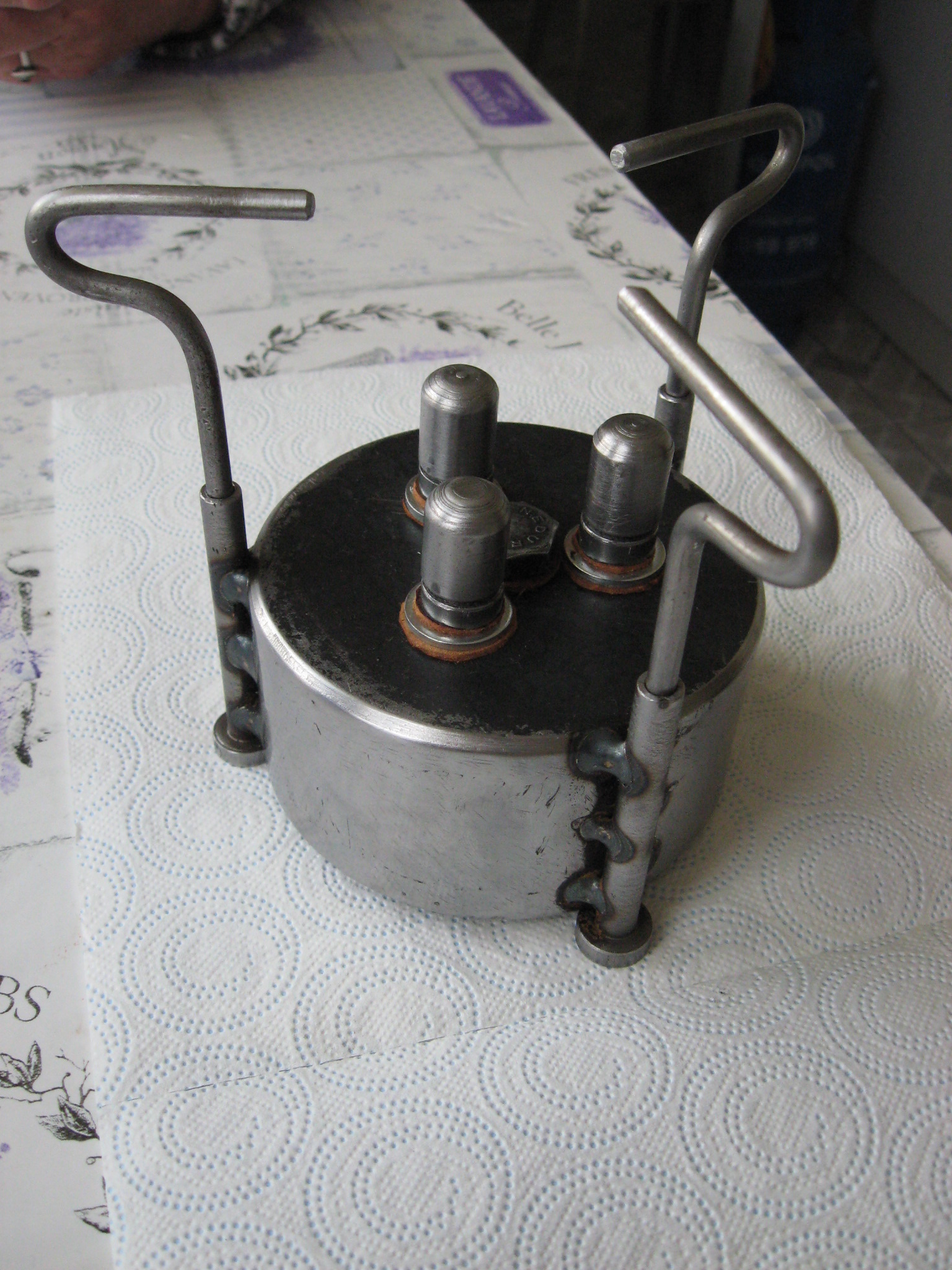 Witajcie improwizacja to jedna z podstawowych umiejętności w survivalu ale nie tylko.Dlatego powstał pomysł w mojej główce by zrobić sobie kuchenkę na paliwo ciekłe.Wykorzystałem do tego kilka elementów odpadowych których bez liku znajduje się w kontenerze na złom obok mojego stanowiska pracy. Tak więc na pierwszy rzut poszedł kawałek rury o średnicy fi 100 1 pręt fi 15 dł ok 40 cm z którego powstały 4 nóżki z których użyłem tylko 3 szt oraz odrzut z blachy z lasera o grubości 5 mm kawałek pręta fi 5.Najpierw zostały przewiercone kółka by zrobić otwory pod gwint M10 następnie wszystko zostało nagwintowane, pospawane nie wyglądało to zbyt ładnie.Więc poszła szlifierka w ruch by ogładzić spawy a następnie pilnik i papier ścierny 180 by spolerować ścianki oraz na tokarce zrobiłem fazki ostrych krawędzi ścianek. Po tygodniu z kawałkiem i stopniowym dorabianiu poszczególnych elementów takich jak 3 palniki,stopki,zaślepki palników,nóżki i uchwyty z pręta wyszło coś takiego.