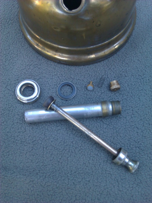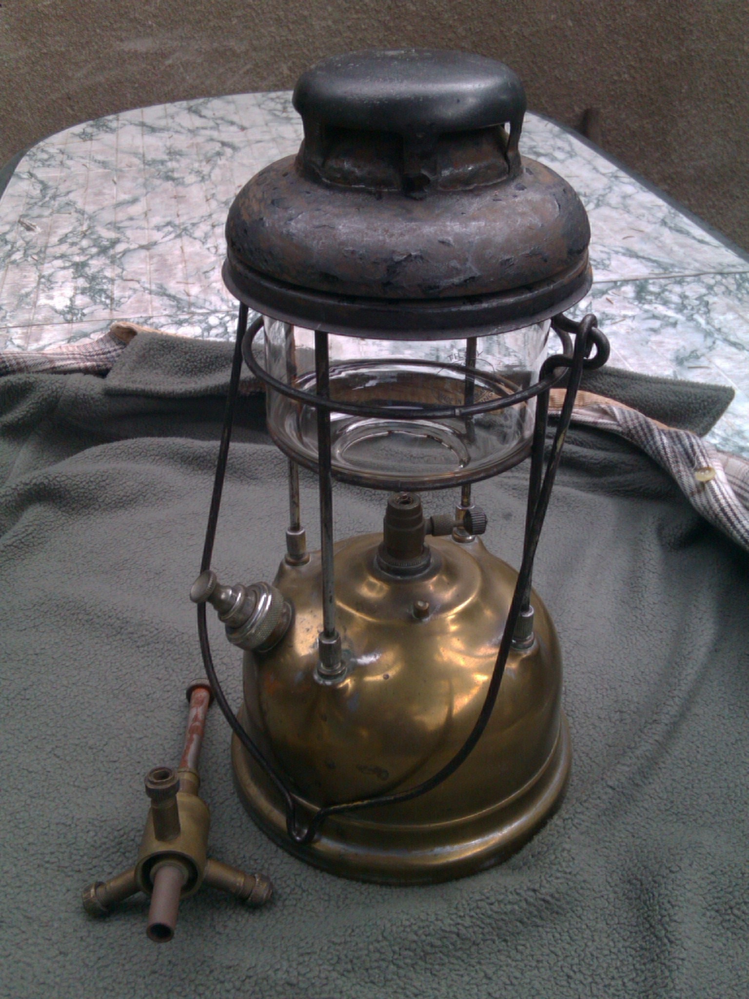 Brak sygnatury jakby ktoś próbował pozbyć się niklu. Zbiornik szczelny mało zasyfiony, pompka kompletna ze sparciałym tłoczkiem. Kosz lekko skorodowany, klosz kontuzjowany, czapkę ktoś próbował ,, restaurować" kątówką. Totalna klapa z gaźnikiem (nadtopiony, niekompletny) i parownikiem. Zaworek i mechanizm podnoszenia igły sprawny.