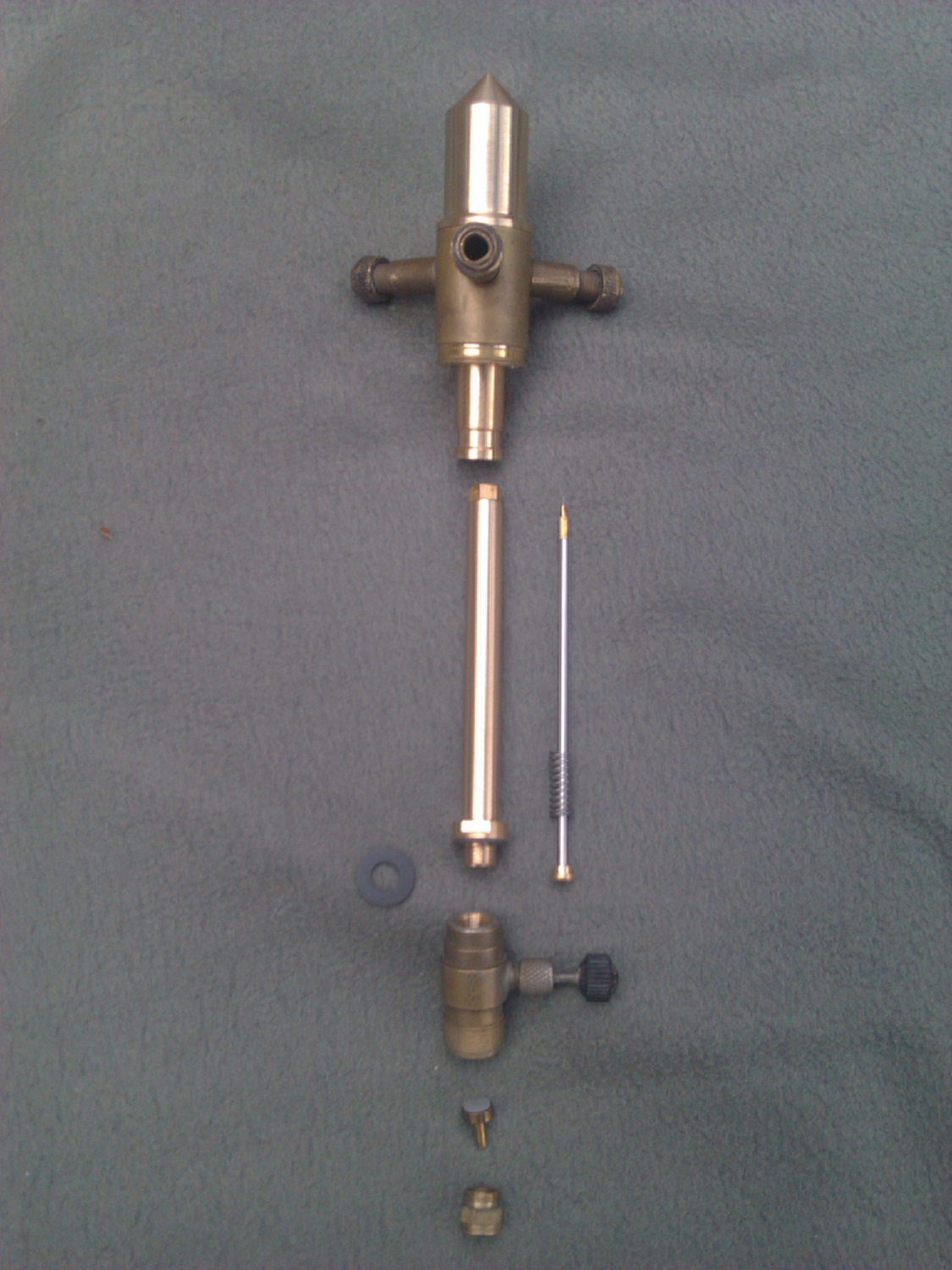 Wszystkie błyszczące elementy ze zdjęcia zostały dorobione i przerobione. Od góry, mieszalnik mojego pomysłu. Parownik o większej średnicy(wiadomo będzie pracować na spirolu), dysza wkręcana od Px-a, żerdź nierdzewna z iglicą także od Px-a, uszczelka wygląda jak ołowiana ale to silikon Smile, pakiet grafitowy w pokrętce zamieniony na o-ring silikonowy no i w dolnym zaworku nowa uszczelka silikonowa.