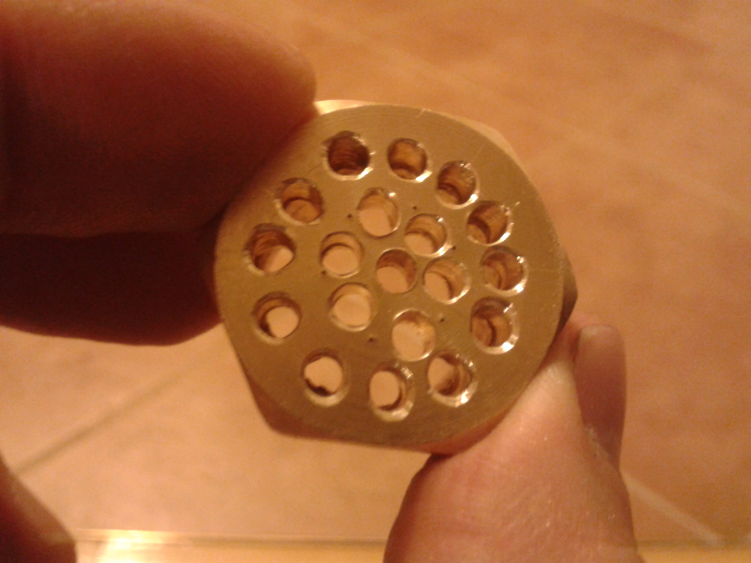 No to dzisiaj z nudów zrobiłem sobie taki brener z mosiężnej zatyczki do rury 3/4. Najprostszym rozwiązaniem wydało mi się wywiercenie w niej dziurek i już. Mimo że się starałem nie wyszło super równo bo wierciłem wkrętarką na stole a imadłem była ręka. Jak widać na załączonych obrazkach to działa. Jeśli chodzi o zgodność gwintu - nie do końca jest on zgodny ale wkręca się i trzyma solidnie.